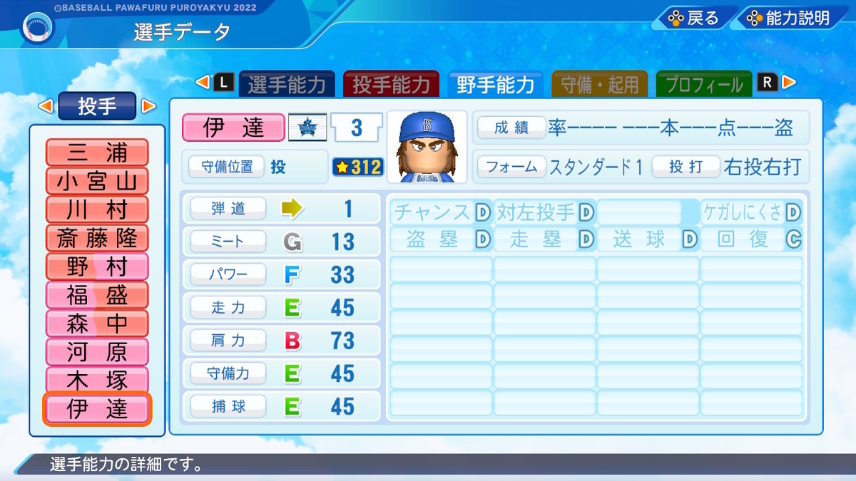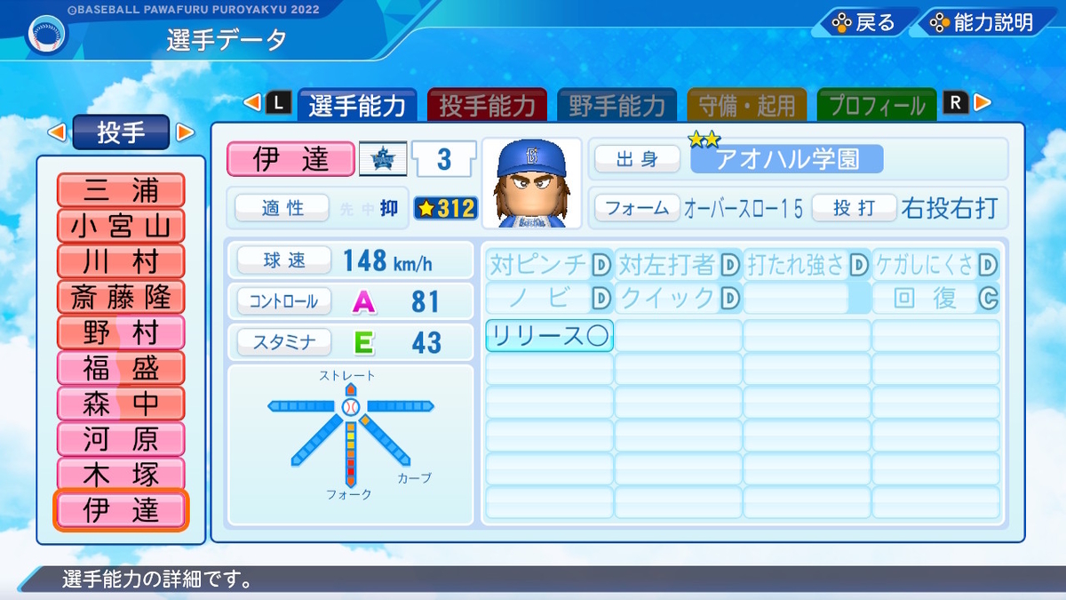 2022-08-21 【パワプロ2022作成】伊達団吉【サクセスキャラ】 パワプロ2022 サクセスキャラ プロ12球団 抜群のコントロールと落差の大きいフォークが武器の抑え投手。伊達様と呼ばれる。 主な登場作 パワプロ7の能力で作成 主な登場作 パワプロ7のサクセス(横浜ベイスターズ)主人公と同じ球団の先輩。 パワプロ10のサクセス(横浜ベイスターズ)他球団の選手。 パワプロ7の能力で作成 「重い球」はなしです。 パワナンバー [12000 11267 94444] パワプロ7 【投打】右投右打 【登板適性】抑え 【球速】 148 km/h 【コントロール】A186 【スタミナ】 E39 【変化球】カーブ1 フォーク7 【投手特殊能力】リリース〇 重い球 【守備位置】 投 【弾道】 1 【ミート】 G1 【パワー】 F50 【走力】 E7 【肩力】 B12 【守備力】 E7 【エラー回避】E7 【野手特殊能力】