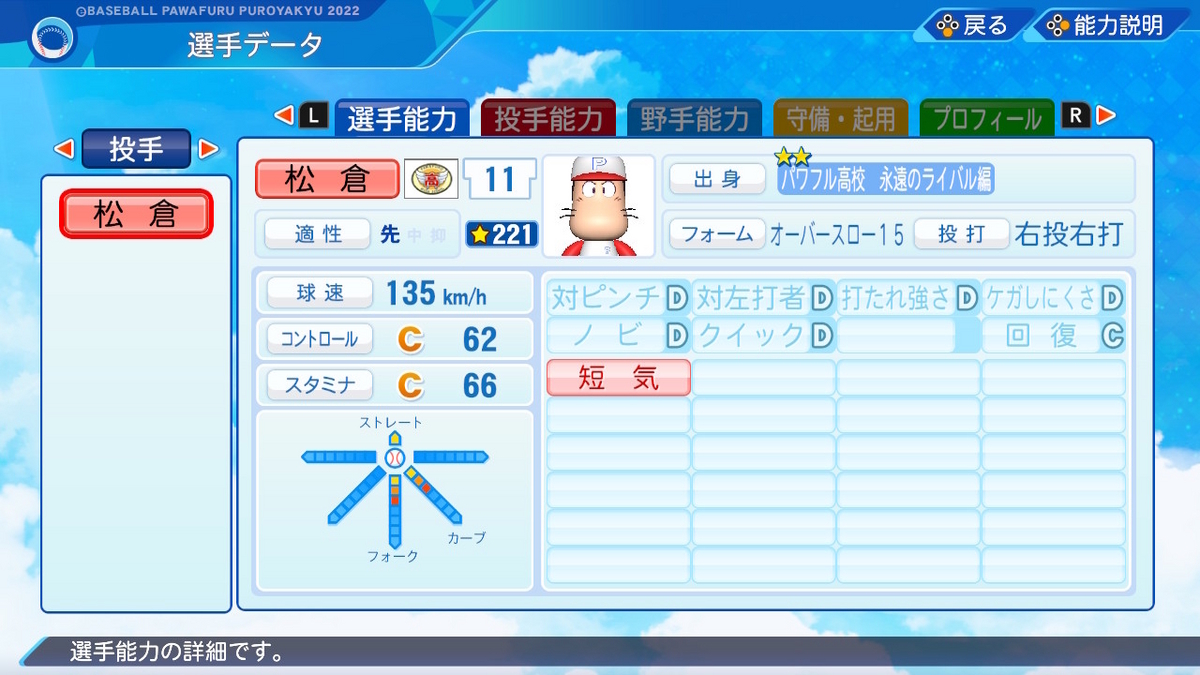 【投手特殊能力】回復C 対強打者〇 短気