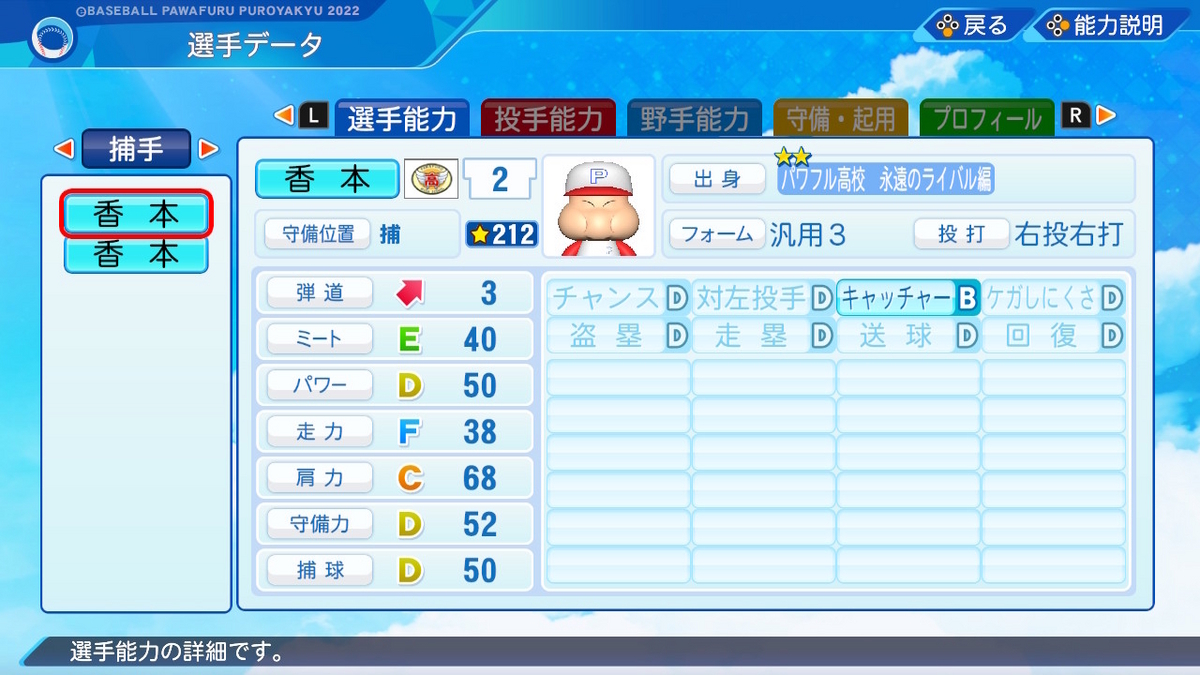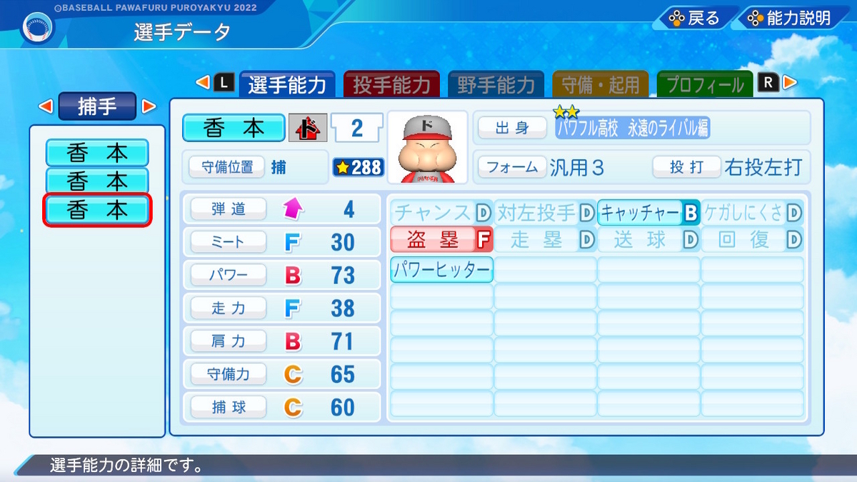 【野手特殊能力】チャンスB キャッチャーB 送球E