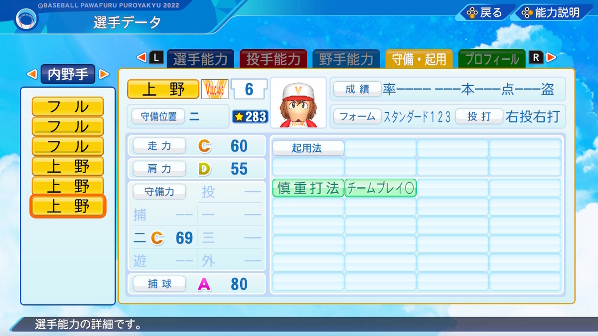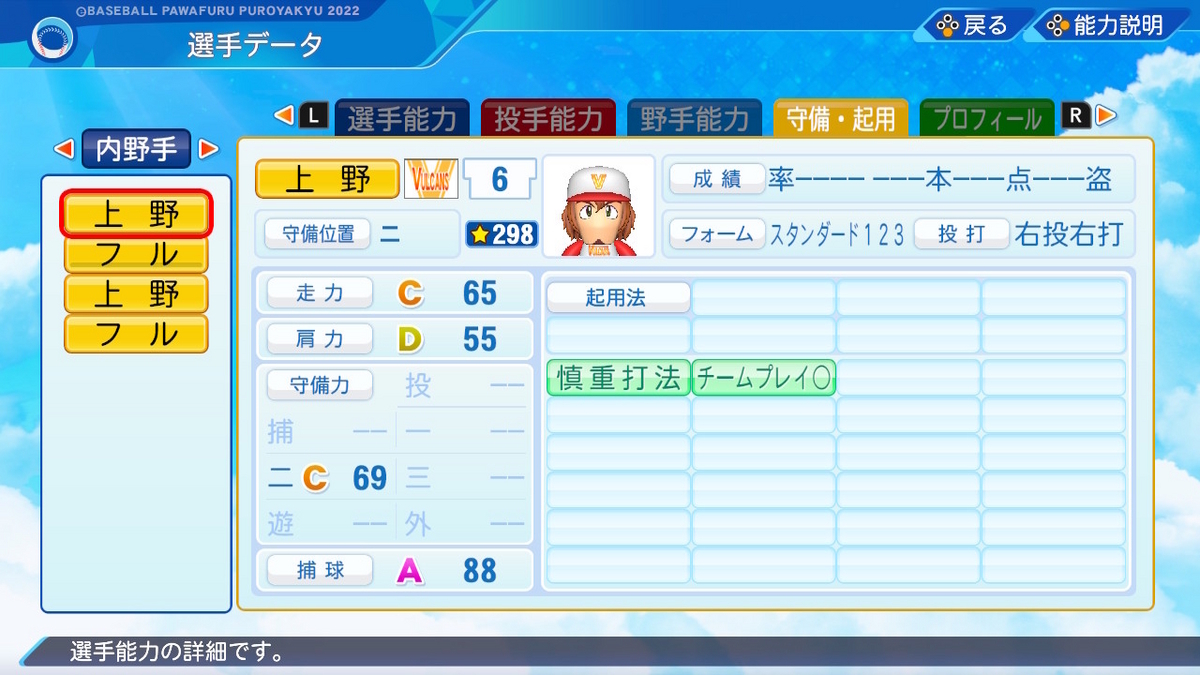 【野手特殊能力】ケガしにくさ4 送球4 バント〇 慎重打法 ゲッツー崩し チームプレイ〇