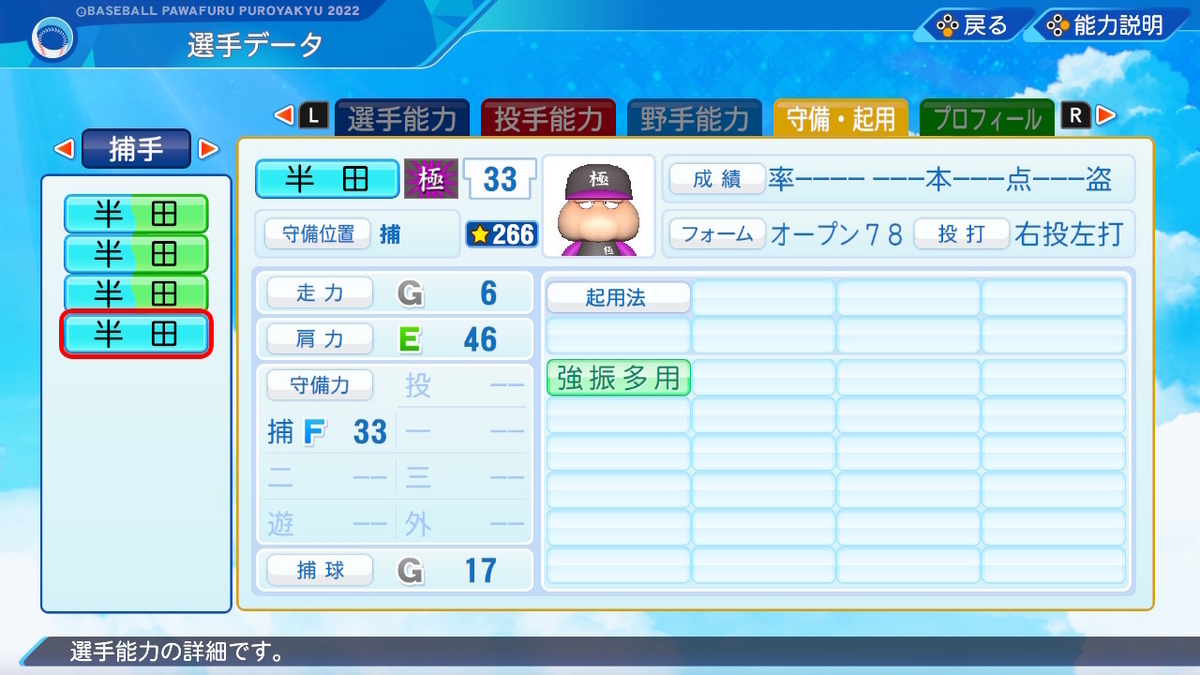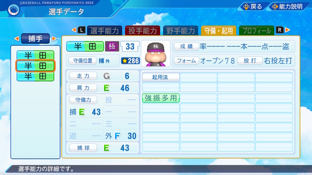 【野手特殊能力】サブポジ2 盗塁4 走塁4 送球4 バント〇 内野安打〇 守備職人 キャッチャー✕