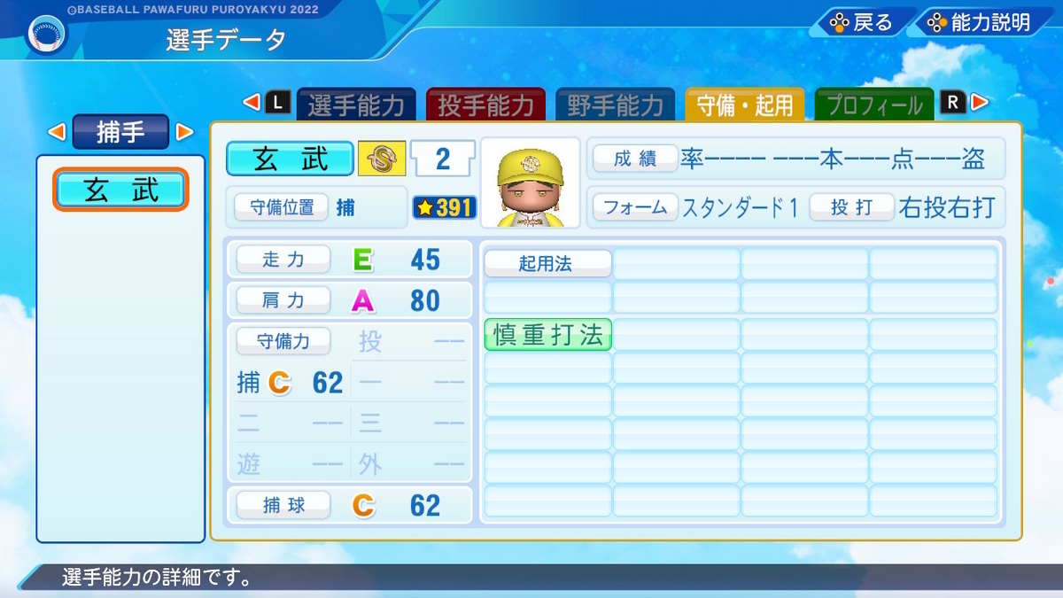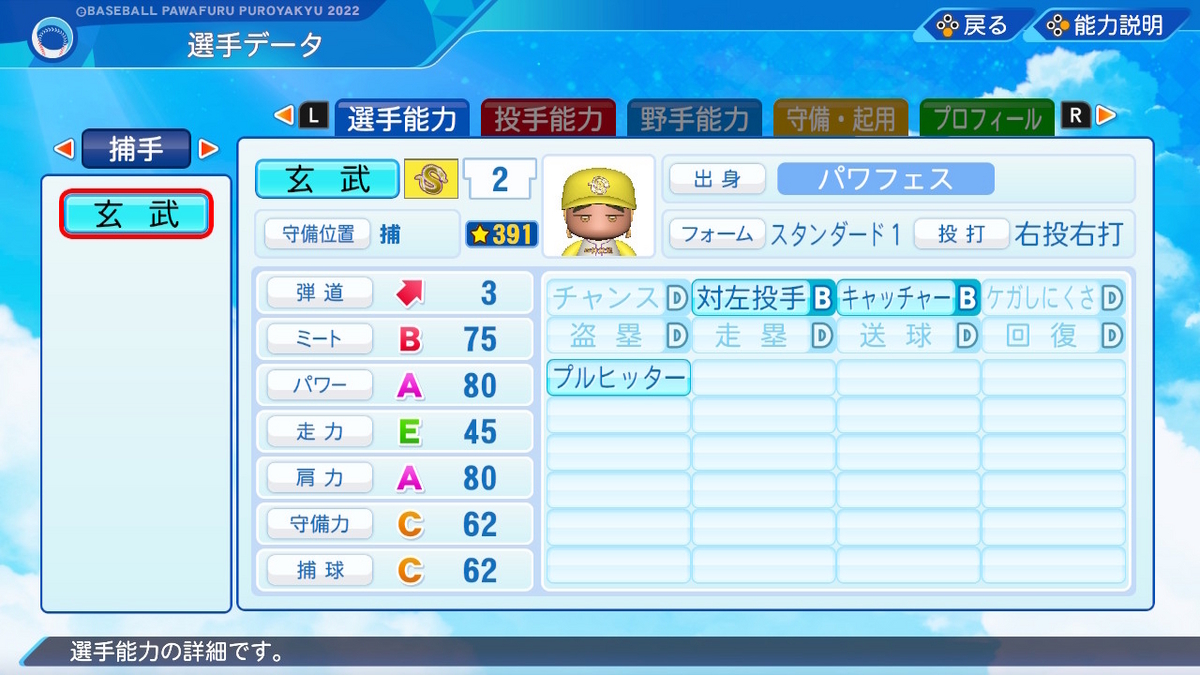 2023-08-15 【パワプロ2022作成】玄武北黒【サクセスキャラ】 パワプロ2022 サクセスキャラ 四神黄龍高校 四神黄龍高校の四神の一人。 主な登場作 最近の能力で作成 主な登場作 パワプロ2011のサクセス(四神黄龍高校)3年夏の甲子園決勝で対戦する。 パワプロ2022のサクセス(永遠のライバル編:四神黄龍高校)甲子園の準決勝か決勝で対戦する。 ※パワフェスの四神黄龍高校には、朱雀しか登場していません。 最近の能力で作成 「ホーム死守」はなしです。 パワナンバー [12900 61893 84121] パワプロ2022 【投打】右投右打 【守備位置】 捕 【弾道】 3 【ミート】 B75 【パワー】 A80 【走力】 E45 【肩力】 A80 【守備力】 C62 【捕球】 C62 【野手特殊能力】対左投手B キャッチャーB プルヒッター ホーム死守 慎重打法