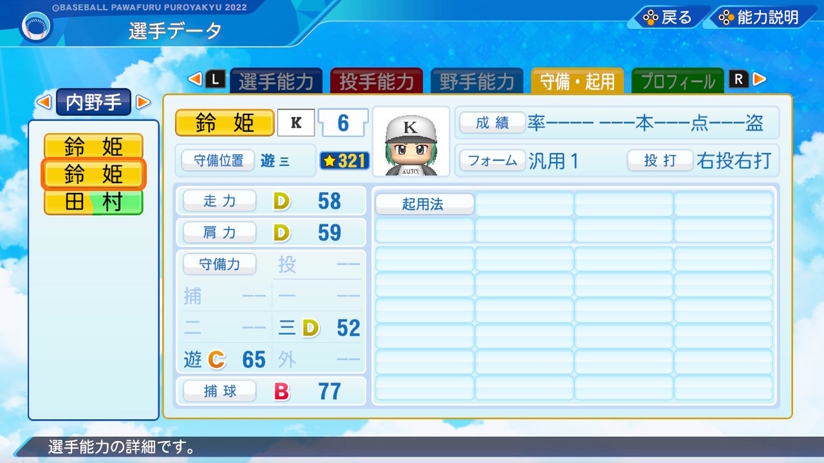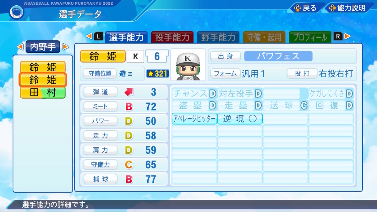2023-09-13 【パワプロ2022作成】鈴姫健太郎【サクセスキャラ】 パワプロ2022 サクセスキャラ 海東学院高校 攻守に優れた後輩遊撃手。 主な登場作 最近の能力で作成 主な登場作 パワポタ3のサクセス(海東学院高校)主人公の1年後輩。 パワプロ2018以降のパワフェス(オール海東学院) パワフェス図鑑(パワプロ2022) 最近の能力で作成 パワナンバー [12100 80032 74066] パワプロ2022 【投打】右投右打 【☆】 321 【守備位置】 遊 三 【弾道】 3 【ミート】 B72 【パワー】 D50 【走力】 D58 【肩力】 D59 【守備力】 C65 D52 【捕球】 B77 【野手特殊能力】送球C アベレージヒッター 逆境〇