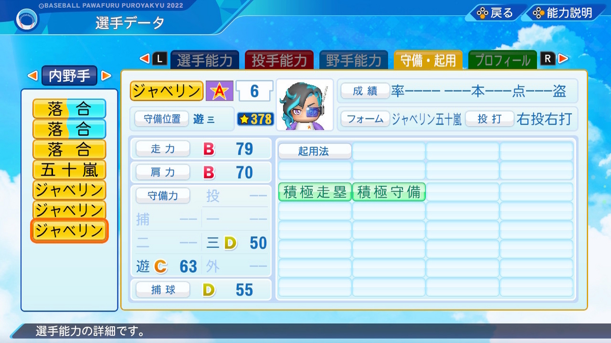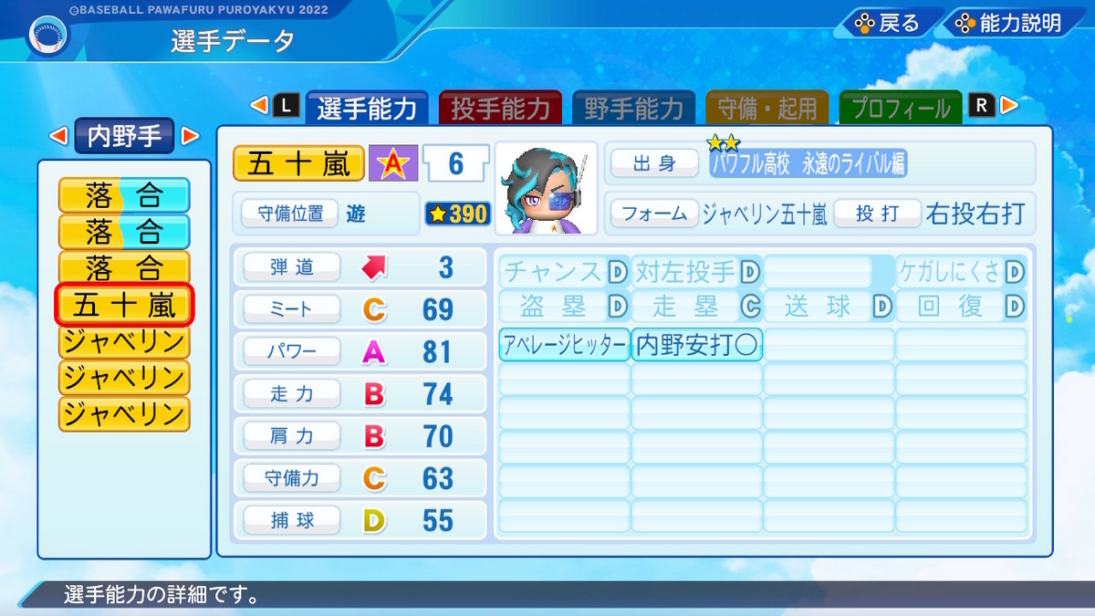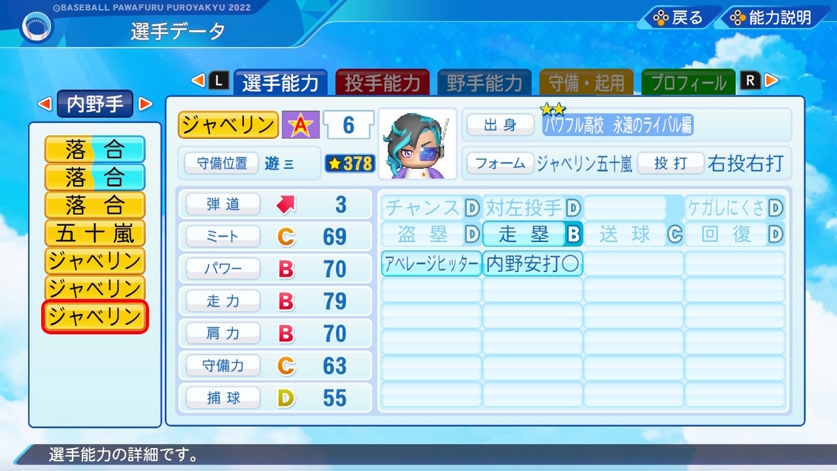 【野手特殊能力】走塁B 送球C アベレージヒッター 内野安打〇 積極走塁 積極守備