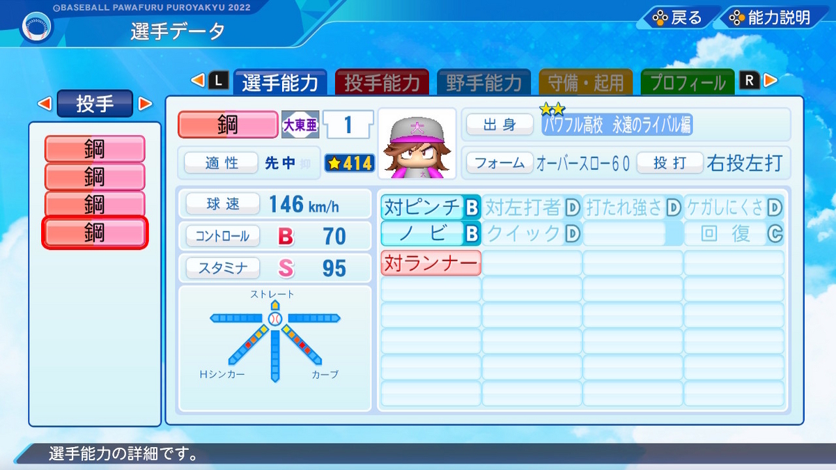 【投手特殊能力】対ピンチB ノビB 回復C 対ランナー