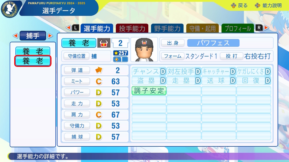パワプロ2024-2025の能力で捕手として作成