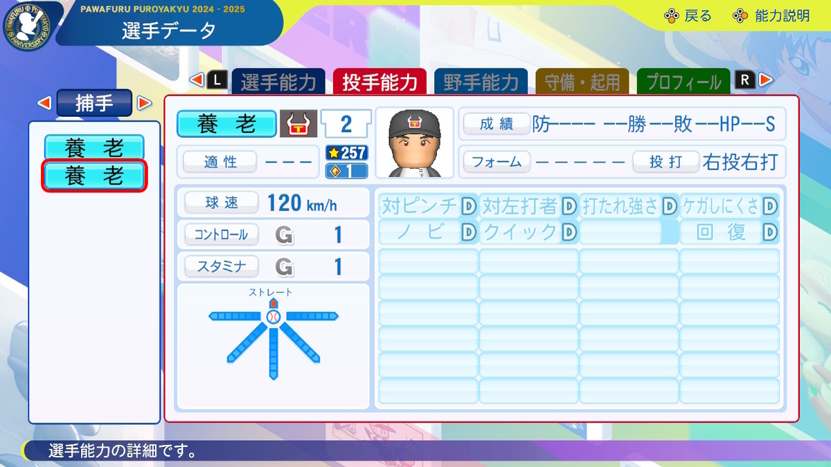 元々が投手能力もある捕手でしたが、なぜか二刀流捕手になって復活しました。ポジションごとの人数合わせもあってメインポジションが投手になったのかもしれませんが、それならモブ投手を入れればいいのに。1チーム29人まででそろえなくてもいいのでは…?そしたら二軍捕手でもいいんだし。