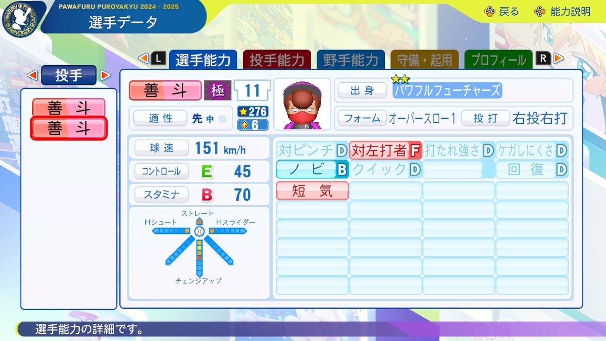 【投手特殊能力】対左打者2 ノビ4 短気 速球中心