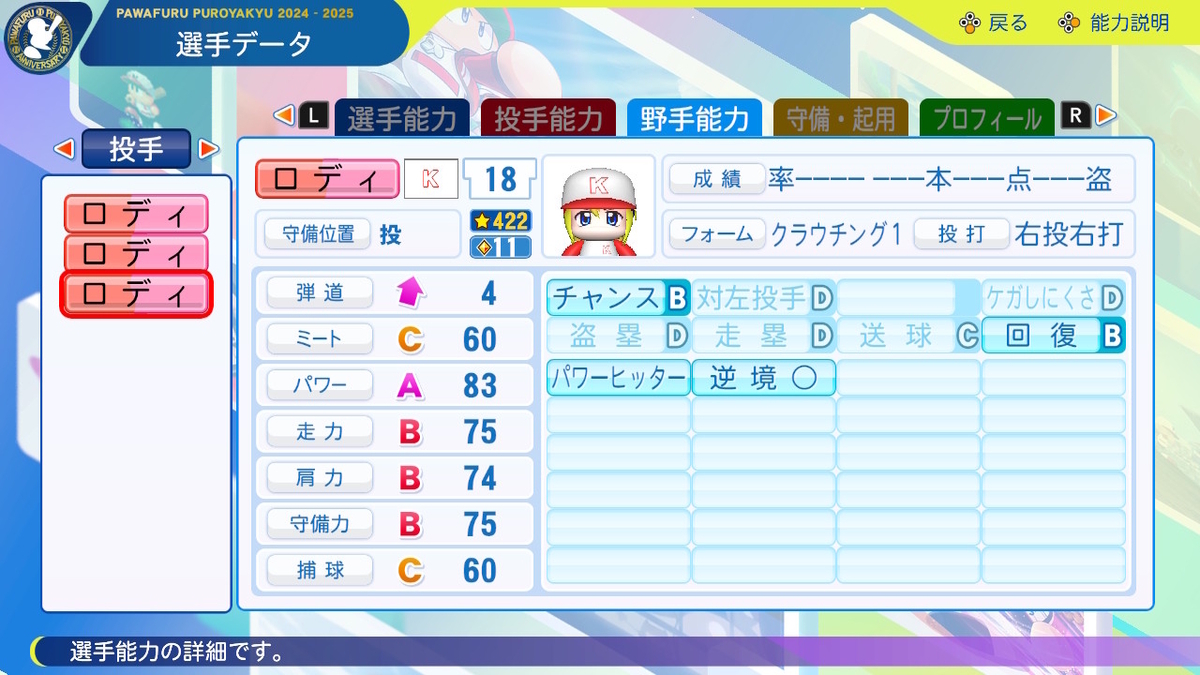 【野手特殊能力】チャンス5 対左投手4 パワーヒッター 初球〇 サヨナラ男 逆境〇