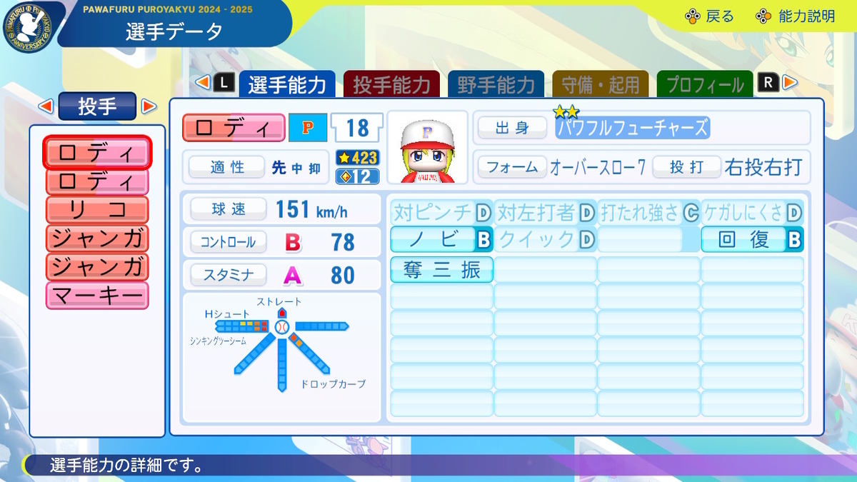 【投手特殊能力】ノビ4 回復4 奪三振