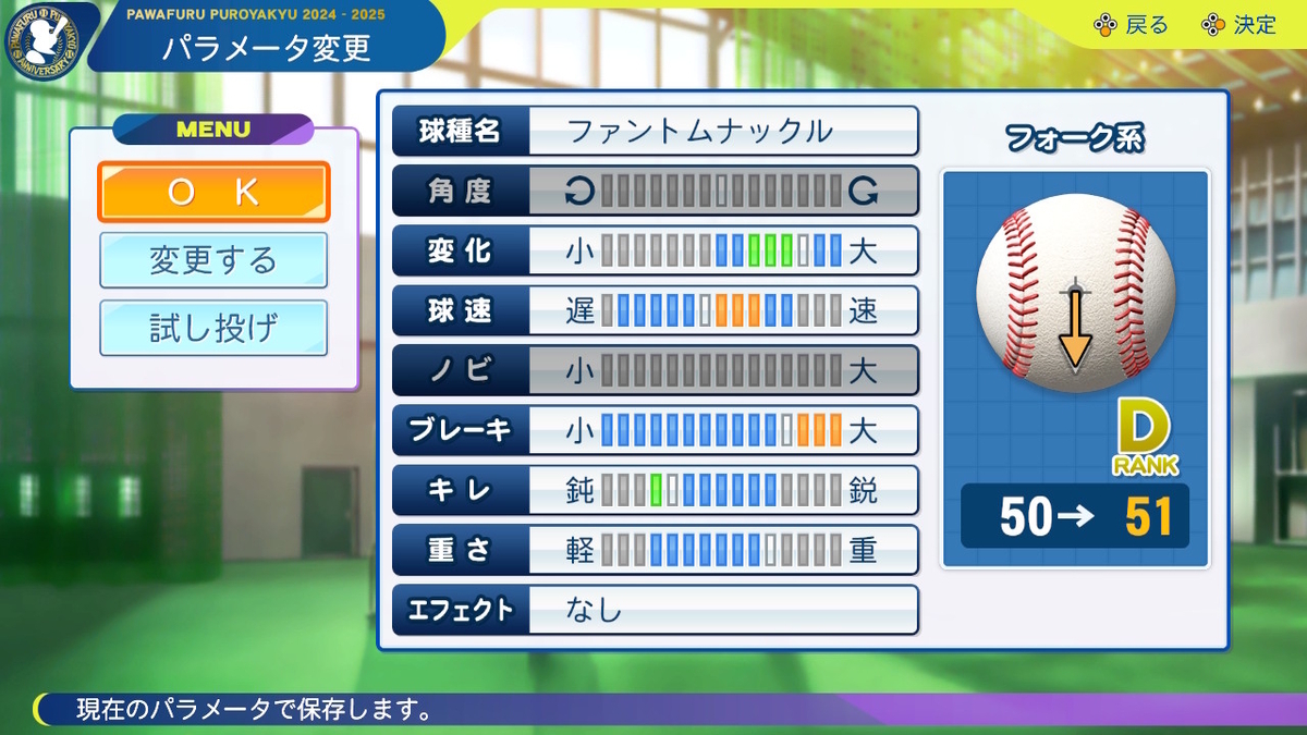 公式パスワード選手のウラミオをアレンジチームに入れてファントムナックルを投げさせてみると、130キロ台後半ときには140キロつまりストレートと同じ球速でブレーキがかからず滑り落ちてくるようなイメージです。変化量はサクセス中のファントムスネークほどではないと思います。新球種開発モードでナックルをベース球種にして球速パラメータを最大まで上げてもこれほど速くはならないです。