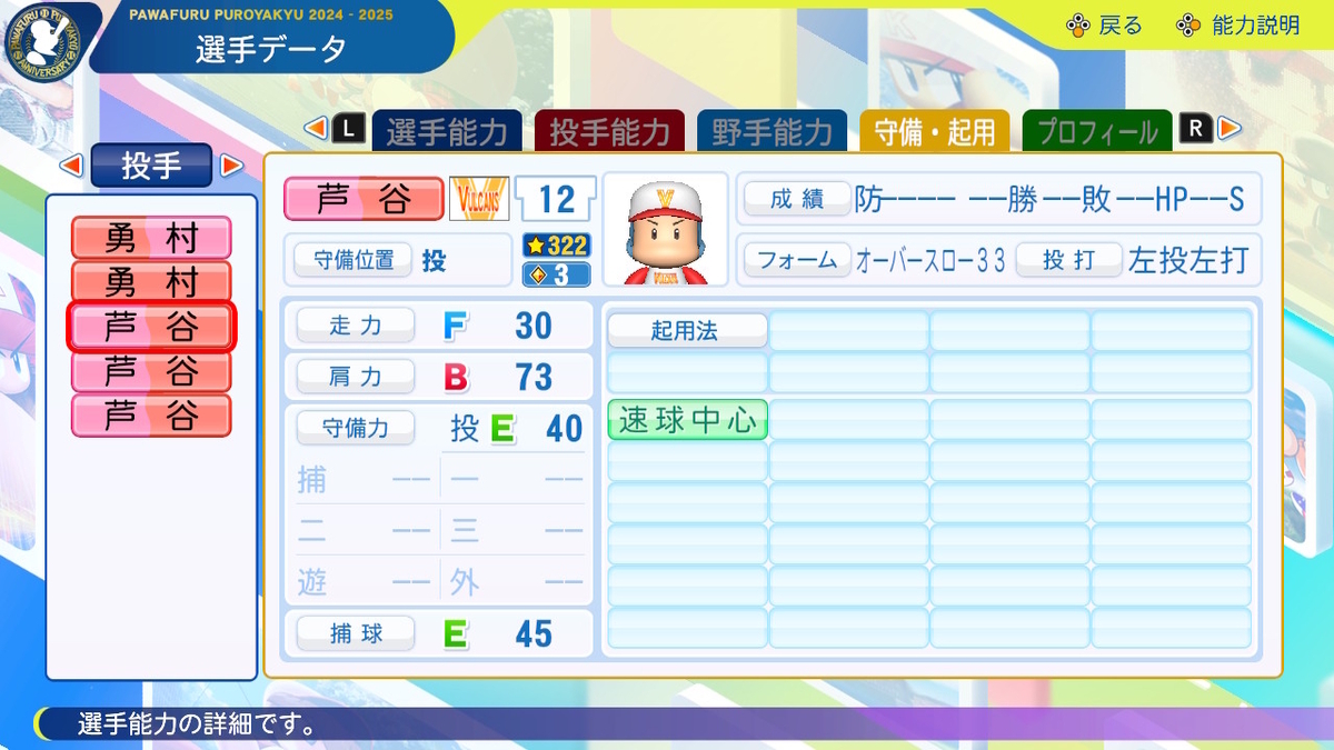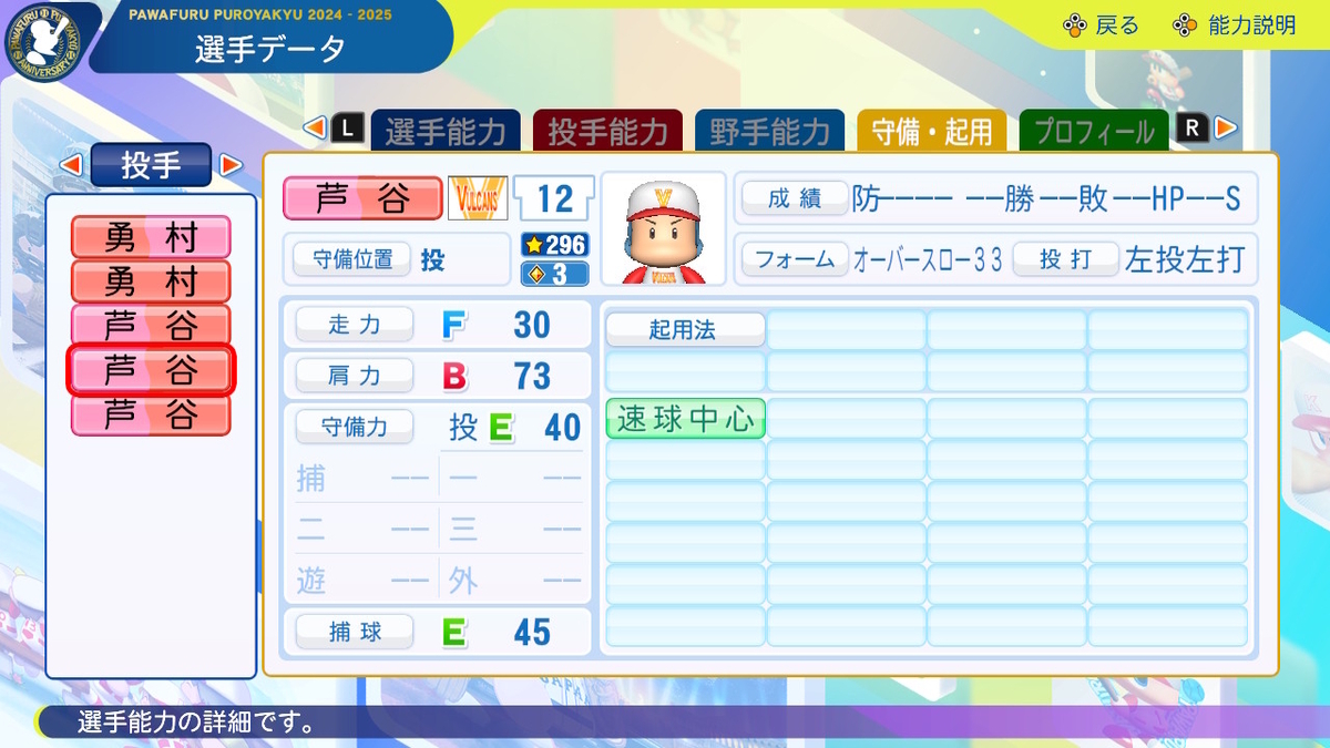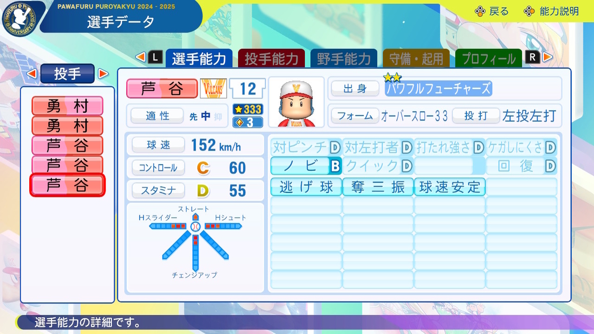 【投手特殊能力】対ピンチ2 対ランナー2 打たれ強さ2 ノビ4 安定度2 逃げ球 奪三振 乱調 速球中心