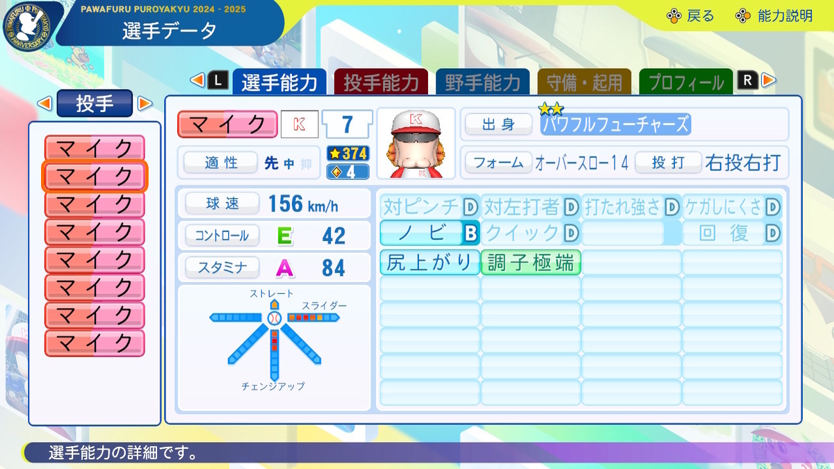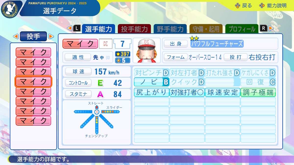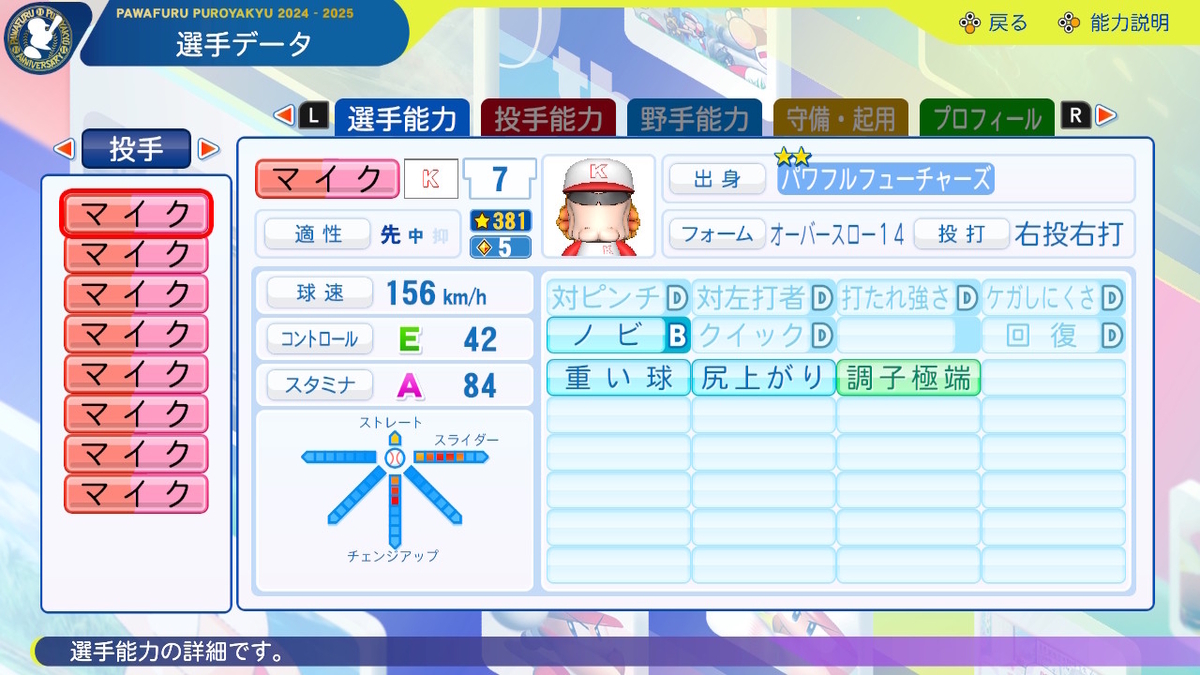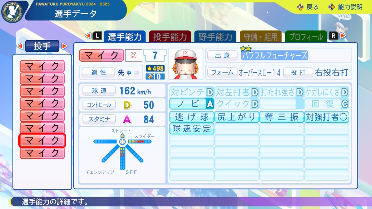 ②球速++、コントロール+、SFF2、回復C、「逃げ球」「奪三振」「対強打者〇」「球速安定」あり、「重い球」なし