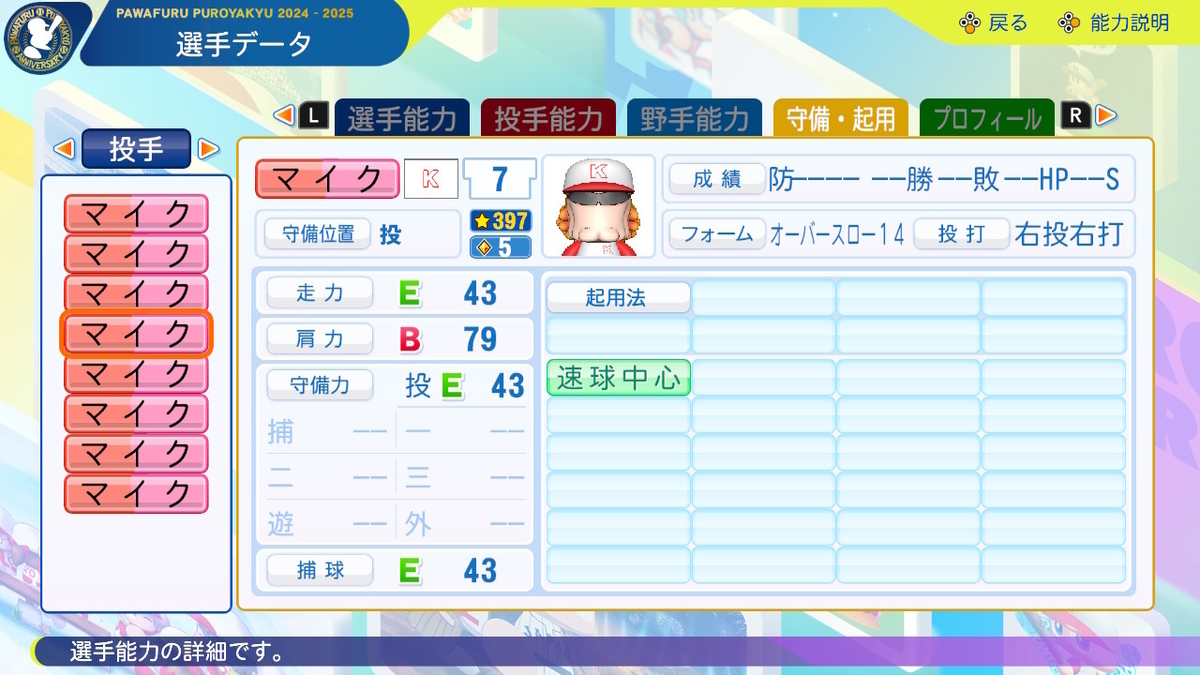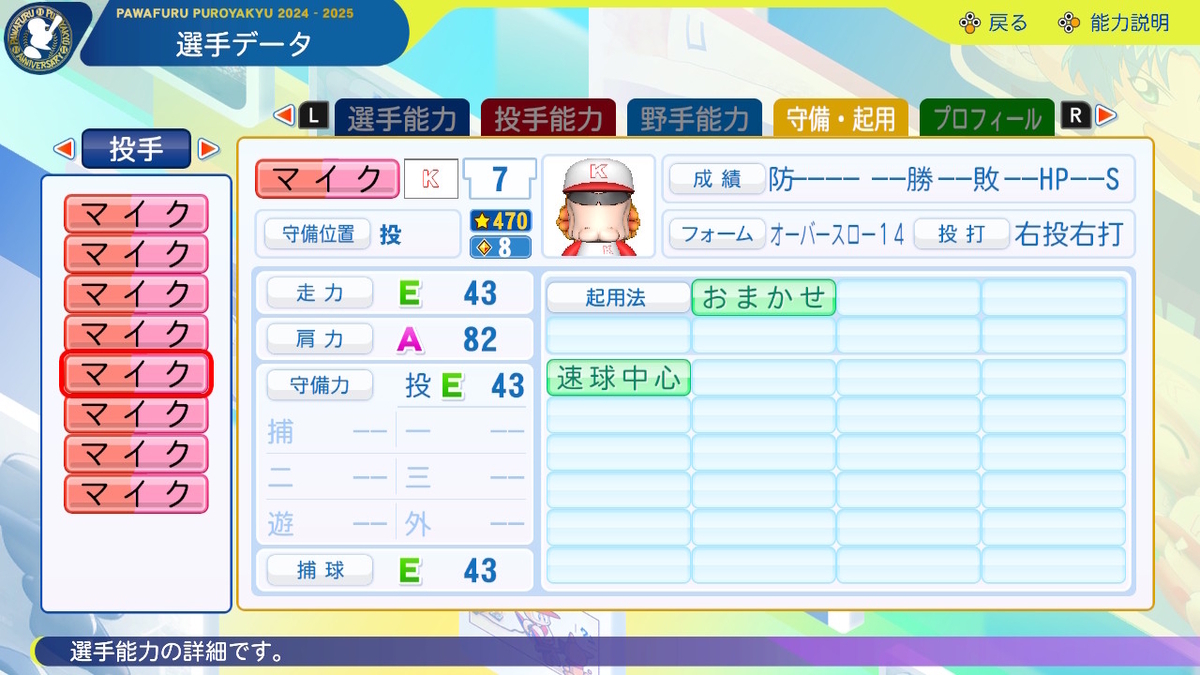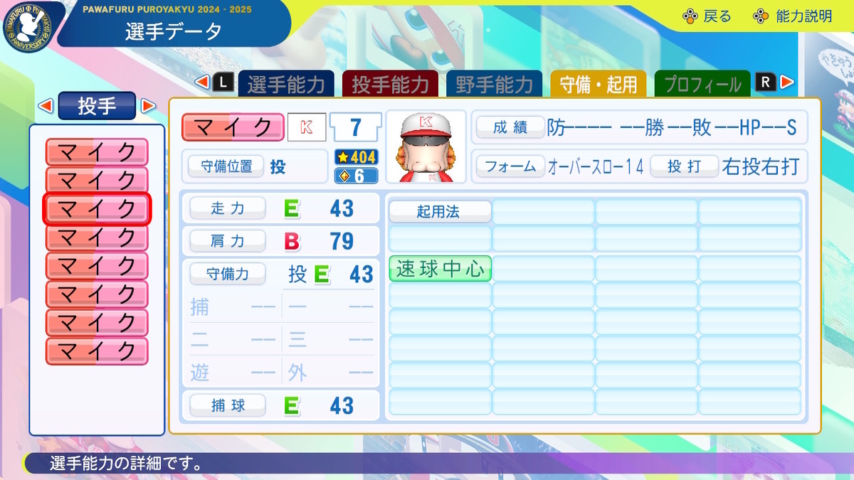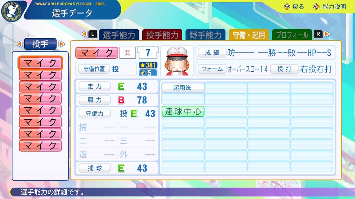 ②球速++、コントロール+、SFF2、回復C、「逃げ球」「奪三振」「対強打者〇」「球速安定」あり、「重い球」なし