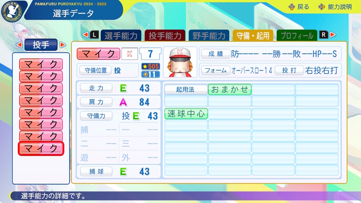 ①球速+++、コントロール++、SFF3、ノビA、回復C、「逃げ球」「奪三振」「対強打者〇」「球速安定」あり、「重い球」あり