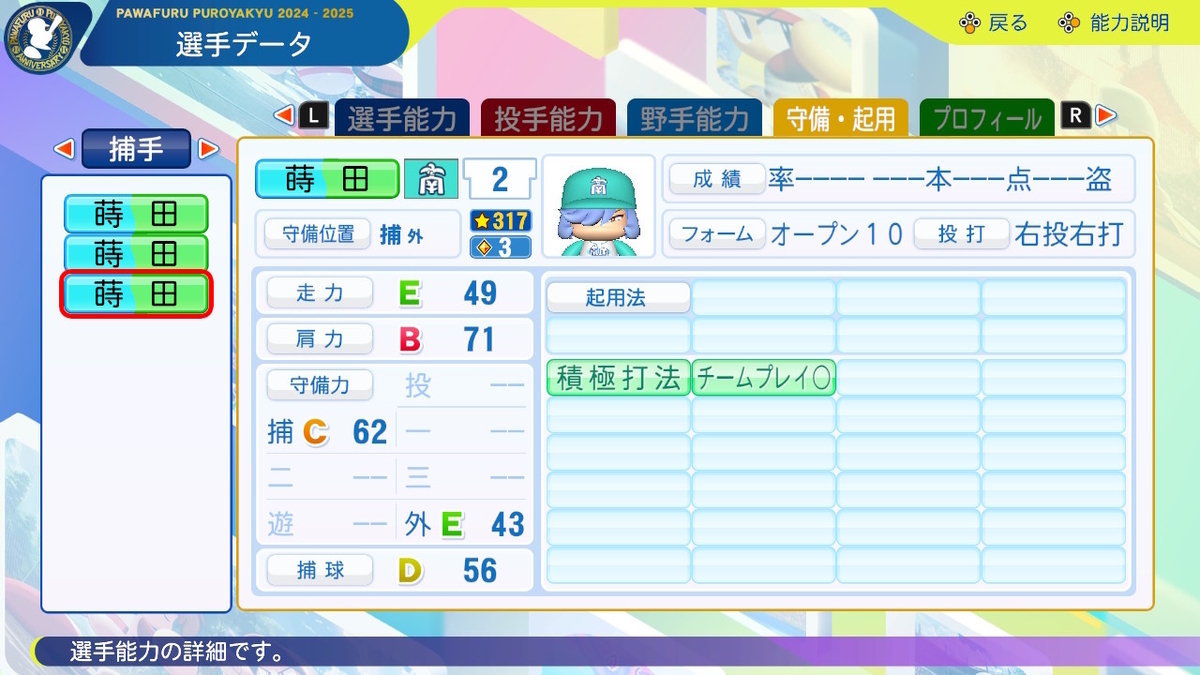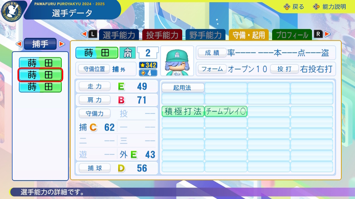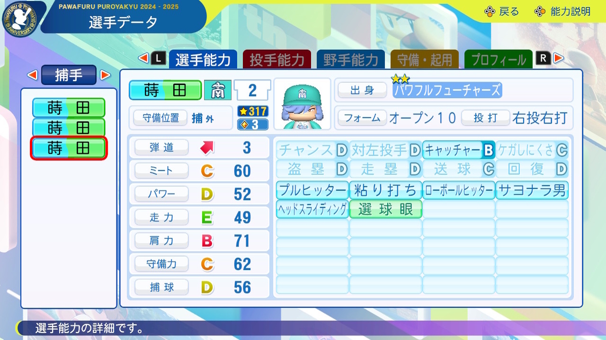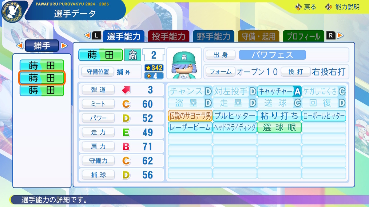 【野手特殊能力】キャッチャーA 送球C ケガしにくさC 伝説のサヨナラ男 プルヒッター 粘り打ち ローボールヒッター ヘッドスライディング(一塁) レーザービーム 選球眼 積極打法 チームプレイ〇