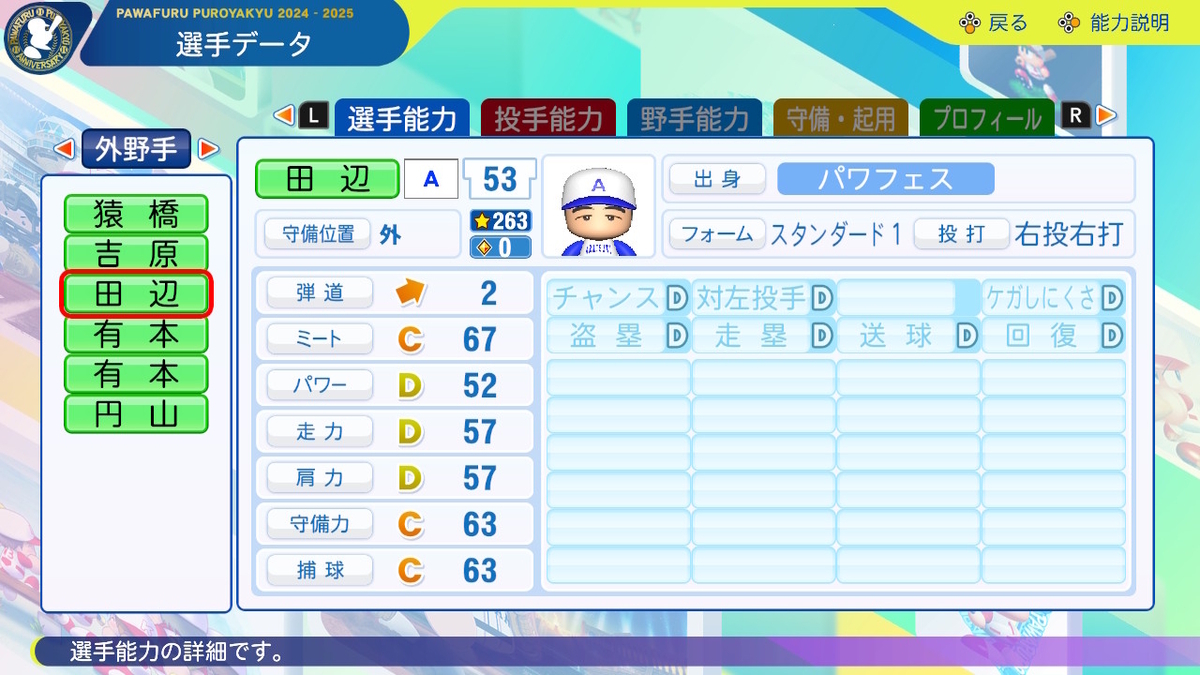2025-02-27 【パワプロ2024-2025】田辺【サクセスキャラ作成】 パワプロ2024-2025 サクセスキャラ あかつき大学 あかつき大学の固有モブ外野手。 主な登場作 パワプロ2024-2025の能力で作成 主な登場作 パワプロサクレジェのJUBC(あかつき大学) パワプロ2024-2025の能力で作成 パワナンバー [13100 80890 83762] パワプロ2024-2025(あかつき大附属高校) 【投打】右投右打 【☆】 263 【守備位置】 外 【弾道】 2 【ミート】 C67 【パワー】 D52 【走力】 D57 【肩力】 D57 【守備力】 C63 【捕球】 C63 【野手特殊能力】 パワプロサクレジェ(JUBC) 【投打】右投右打 【守備位置】 外 【弾道】 2 【ミート】 C11 【パワー】 D82 【走力】 D9 【肩力】 D9 【守備力】 C10 【エラー回避】C10 【野手特殊能力】